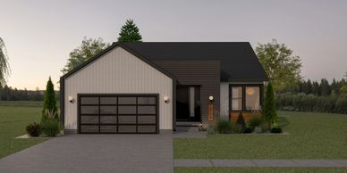 Solace is a 1,750 sq. ft. ranch with a 1,500 sq. ft. basement. It features 3 bedrooms, 2 bathrooms, and a 2-car garage. Highlights include a modern fireplace, cathedral ceilings, walk-in